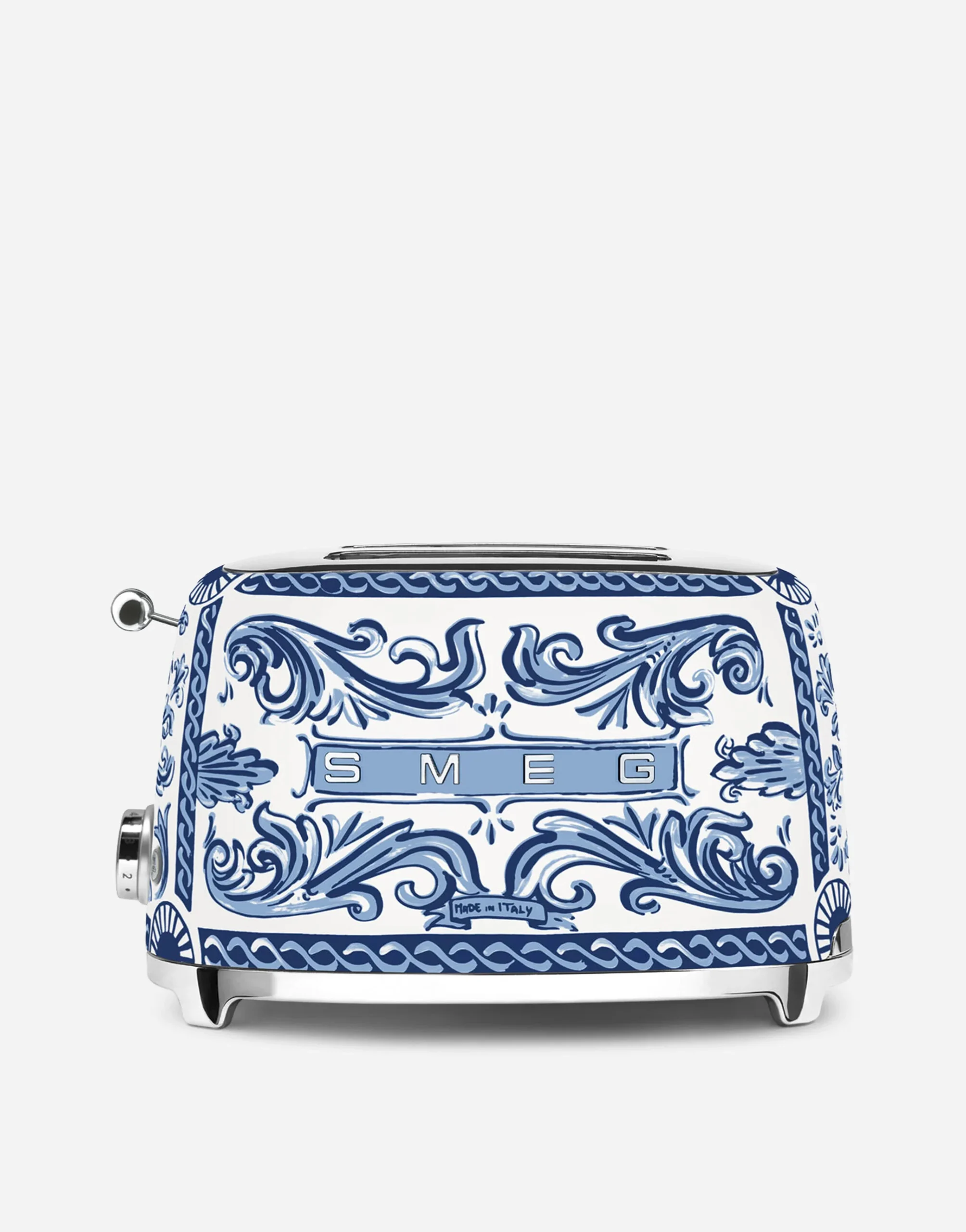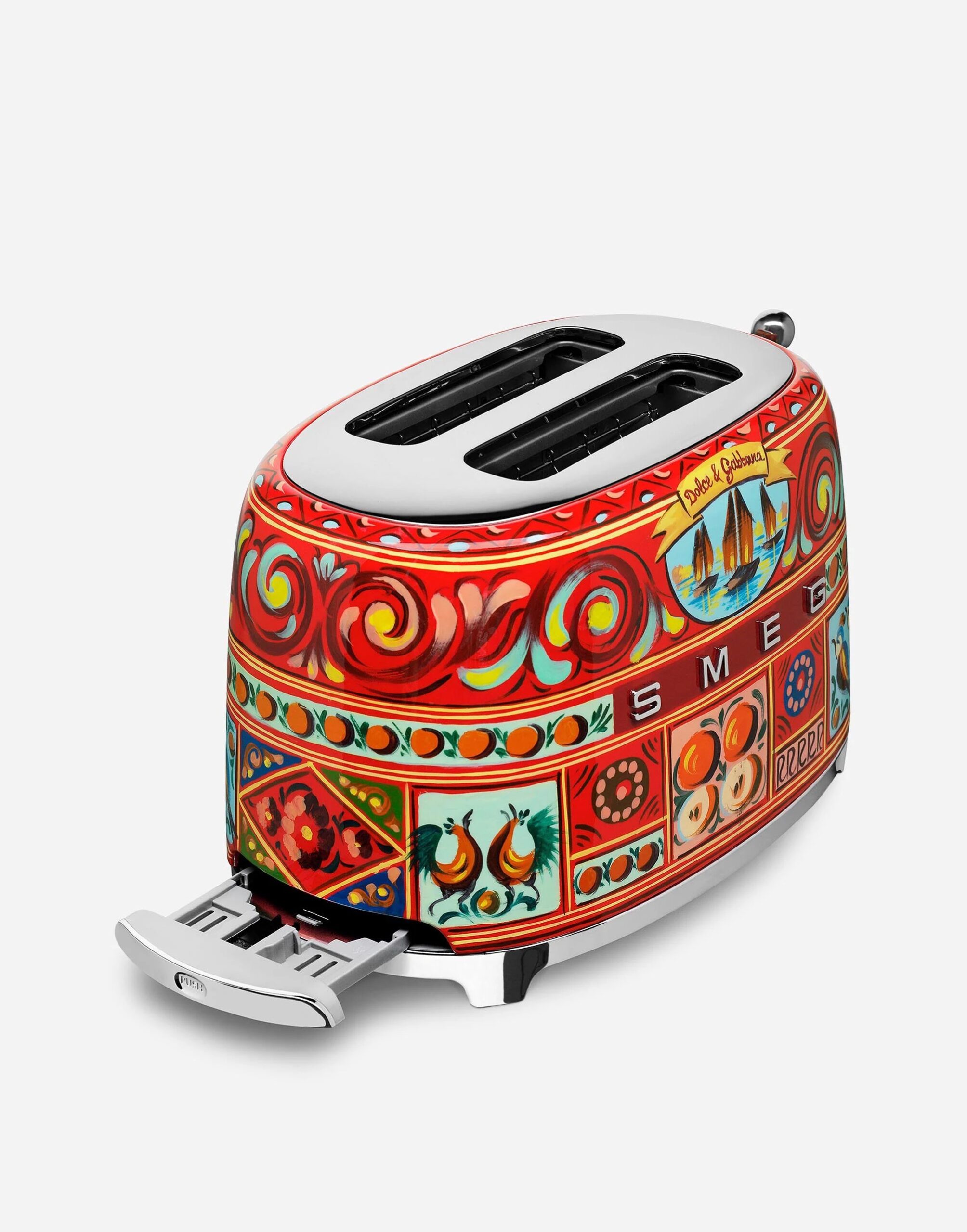 Traditional Sicilian handicraft is the inspiration for the decorations of this 2-slice toaster. This marvellous object is adorned in the manner of ‘bummuli’ and ‘quattare’, typical terracotta vases from Sicily, painted in the same style as the traditional cart. The iconography features various types of birds, including majestic roosters and sailboats heading off towards the Mediterranean horizon.